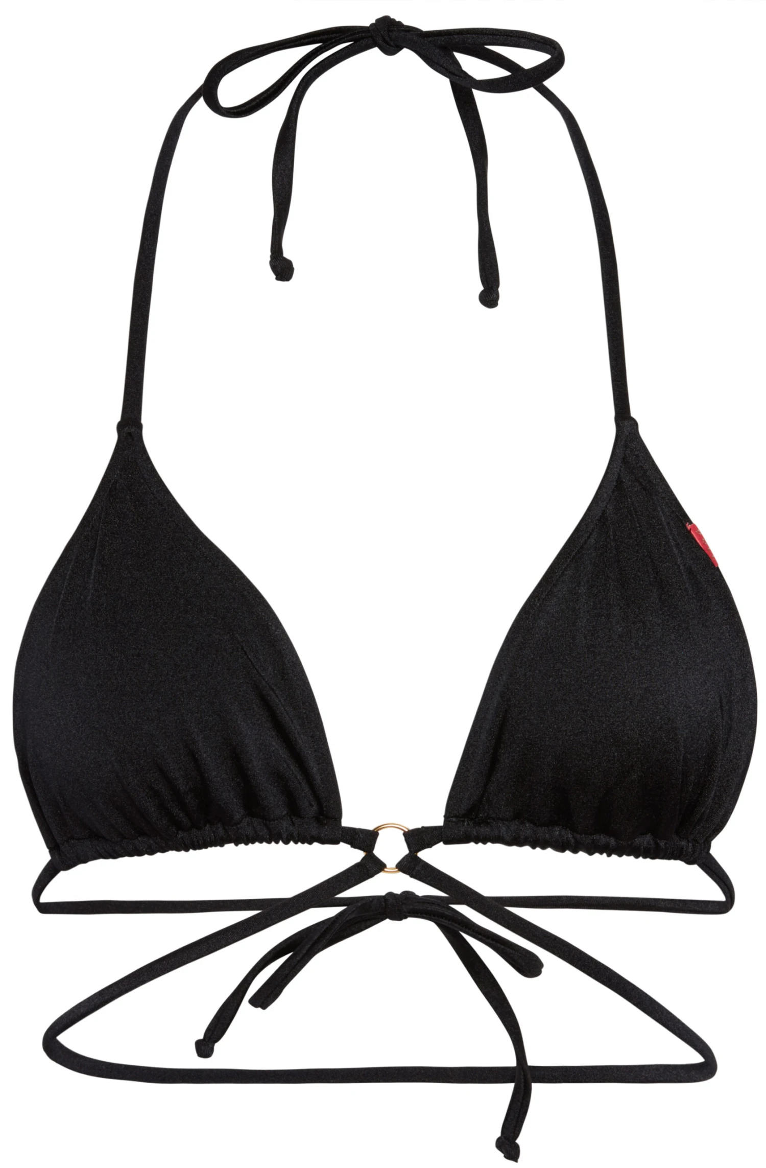 DETAILS: Made in the USA, fully self-lined. Solid black body, clean finish with no binding. Adjustable triangle bikini top with skinny neck ties, center loop hardware, bust pad pockets, and wrap around strap. CARE INSTRUCTIONS: Hand wash, line dry, no bleach, cool iron if necessary.