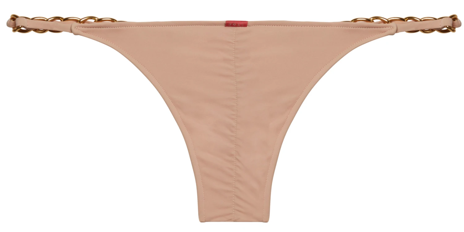The DOLL exclusive “Bikini on a Chain” bikini bottoms. Made with love in sunny SoCal. DETAILS: Made in the USA. Fully lined. micro rise scrunch bottoms with wide gold chain accents. CARE INSTRUCTIONS: Hand wash, line dry, no bleach, cool iron if necessary.