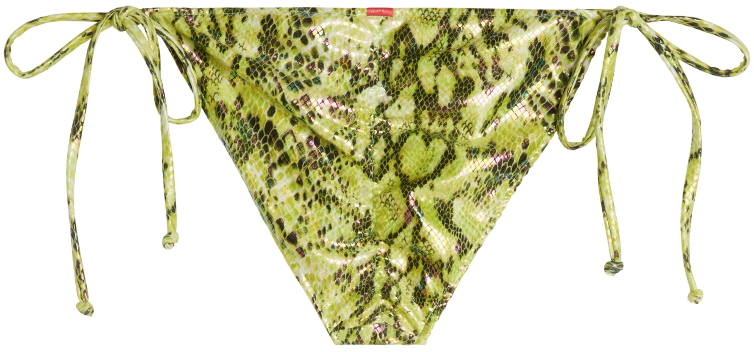 Adventure through the sandy beaches and calm waves with our clean, simple and timeless bikinis! Featuring our signature adjustable triangle top in our sexy holographic green snake print! DETAILS: Made in the USA, fully lined – clean finish with no binding trim. Adjustable triangle string bikini top with skinny neck ties and bust pad pockets. CARE INSTRUCTIONS: Hand wash, line dry, no bleach, cool iron if necessary.