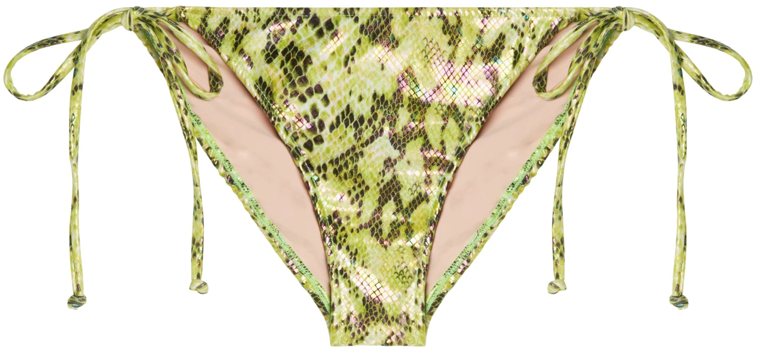 Eat. Sleep. Beach. Repeat. Featuring a sexy holographic snake print in our full coverage bottom, a more modest coverage without compromising style. Keep comfortable & confident! DETAILS: Made in the USA, fully lined – clean finish with no binding trim. Full coverage scrunch bottoms with side ties. CARE INSTRUCTIONS: Hand wash, line dry, no bleach, cool iron if necessary.