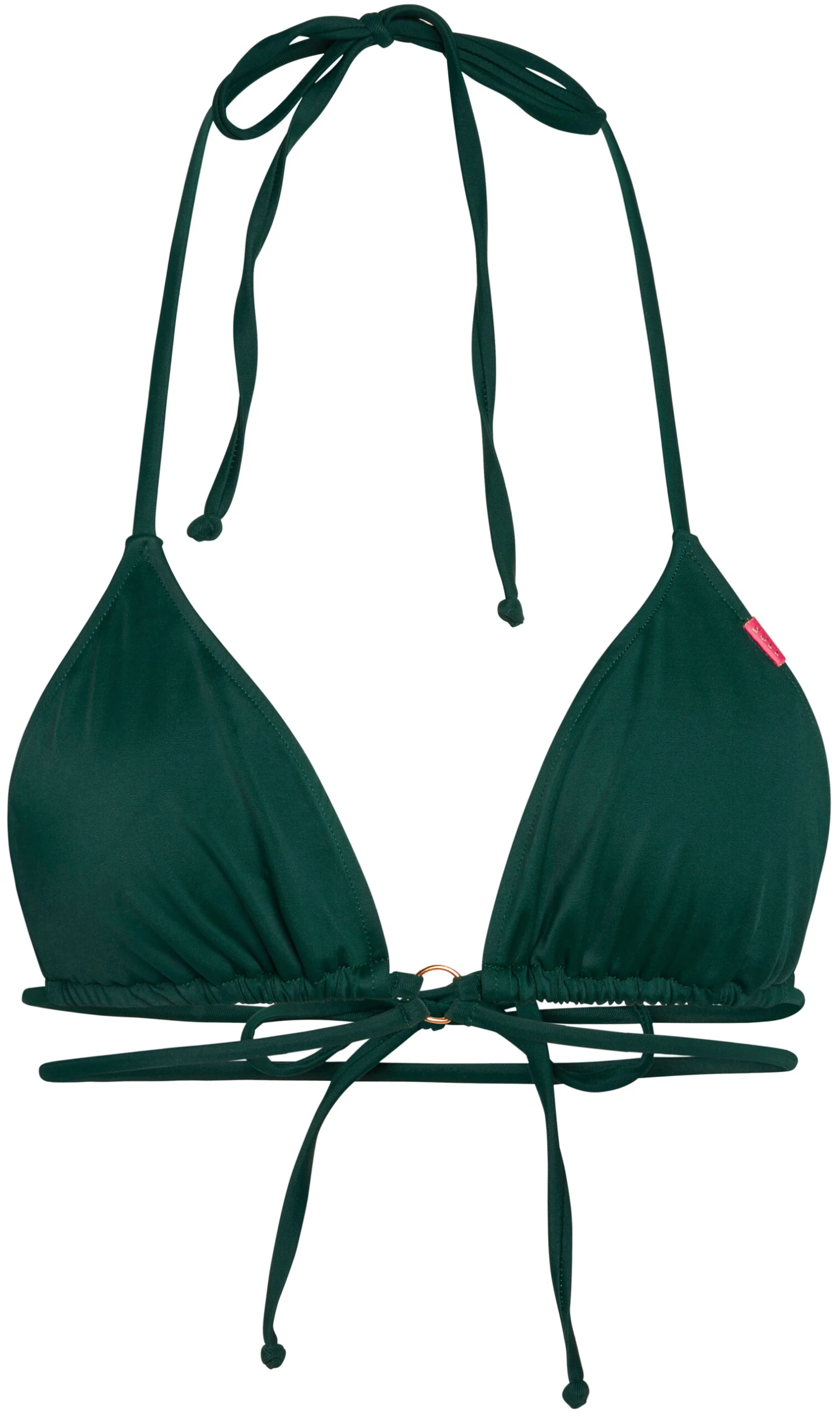 DETAILS: Made in the USA, fully self-lined. Hunter Green body, clean finish with no binding. Adjustable triangle bikini top with skinny neck ties, center loop hardware, bust pad pockets, and wrap around strap. CARE INSTRUCTIONS: Hand wash, line dry, no bleach, cool iron if necessary.