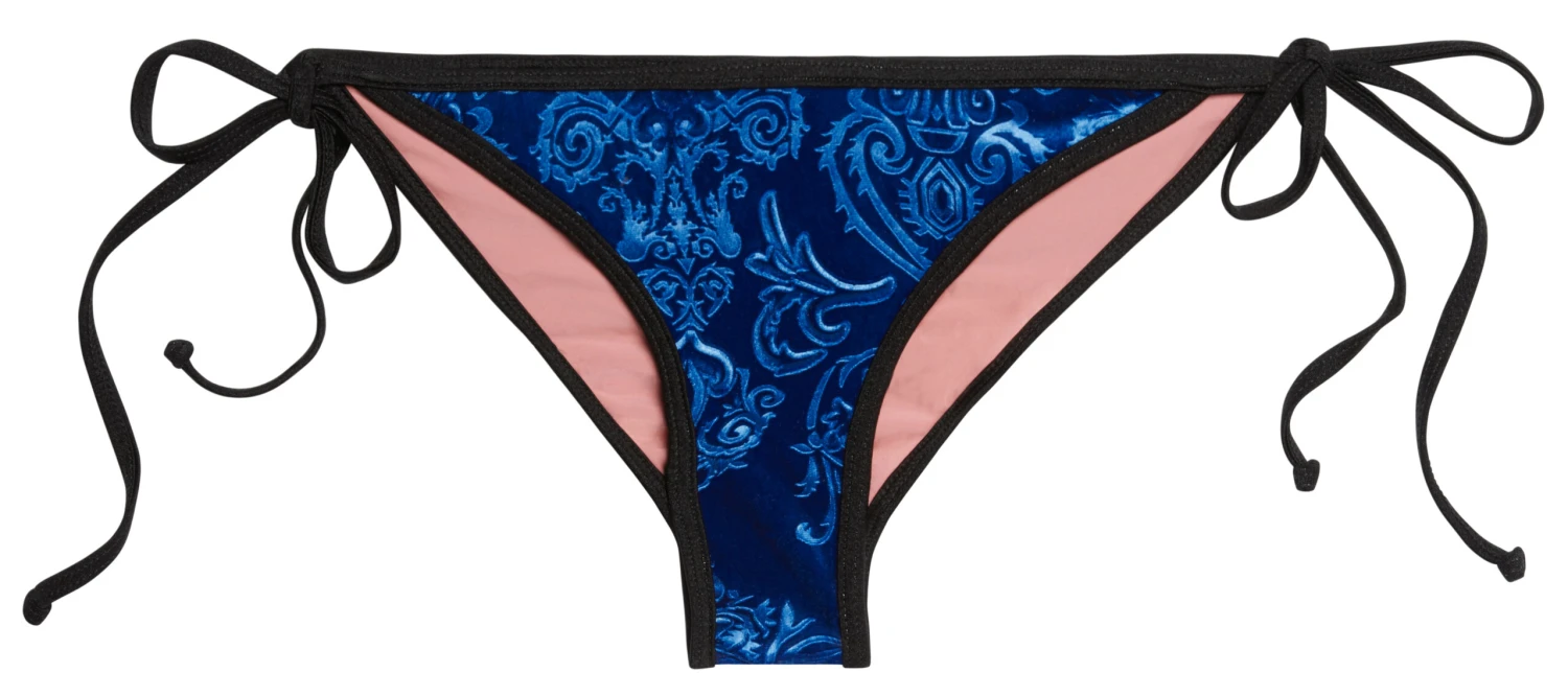 DETAILS: Made in USA, fully lined. Embossed stretch velvet, solid black binding. Single rise scrunch bottoms with side ties. CARE INSTRUCTIONS: Hand wash separately, cold water, mild detergent, lay flat to dry. Do not bleach, wring, iron or dry clean. Wash immediately after extreme perspiration.