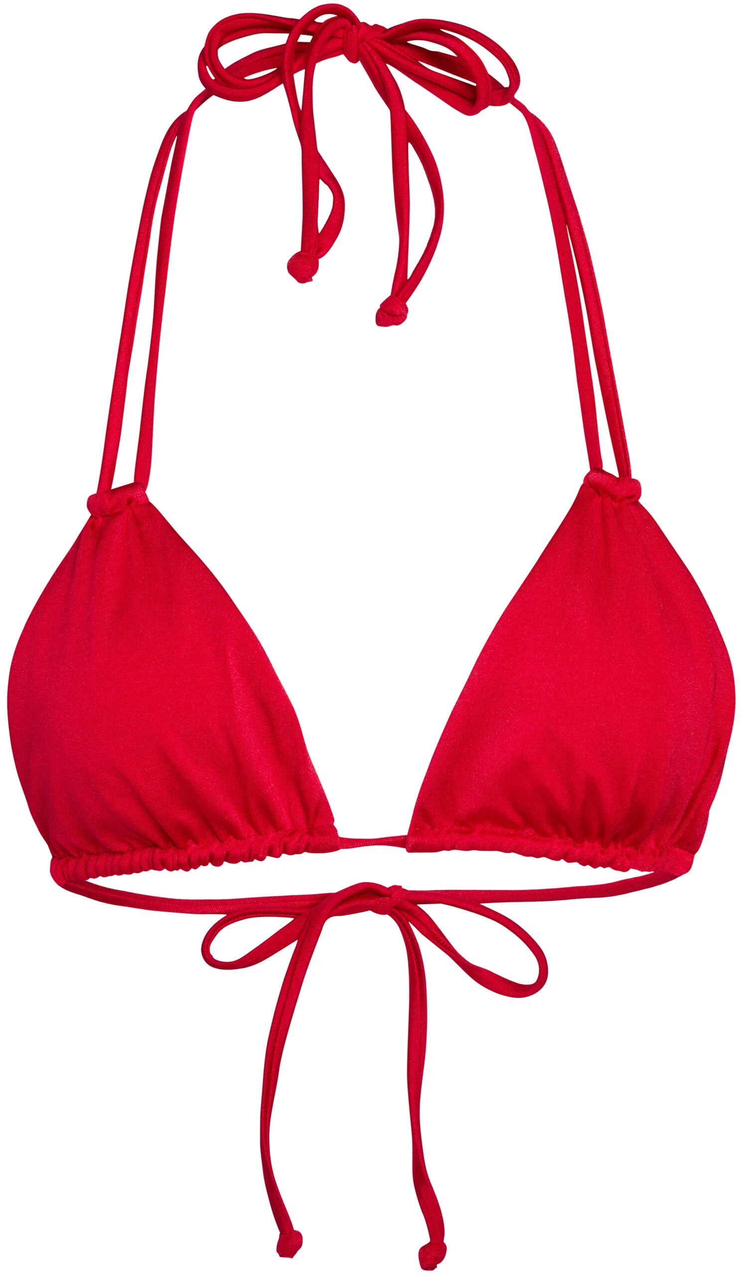 Solid red double strap bikini top. DETAILS: Made in the USA, fully lined. Adjustable triangle string bikini top, skinny double strap skinny neck ties, bust pad pockets. CARE INSTRUCTIONS: Hand wash, line dry, no bleach, cool iron if necessary.