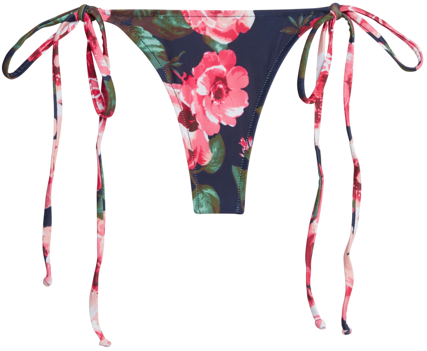Rose Garden print side tie g-string thong bikini bottoms. DETAILS: Made in the USA, fully lined. G-String thong bikini bottoms with side ties. CARE INSTRUCTIONS: Hand wash, line dry, no bleach, cool iron if necessary.