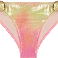 Adventure through the sandy beaches and calm waves with our clean, simple and timeless bikinis! Featuring our signature sunset shimmer adjustable triangle top with gold trim! DETAILS: Made in the USA, fully lined – clean finish with no binding trim. Adjustable triangle string bikini top with skinny neckties and bust pad pockets. CARE INSTRUCTIONS: Hand wash, line dry, no bleach, cool iron if necessary.