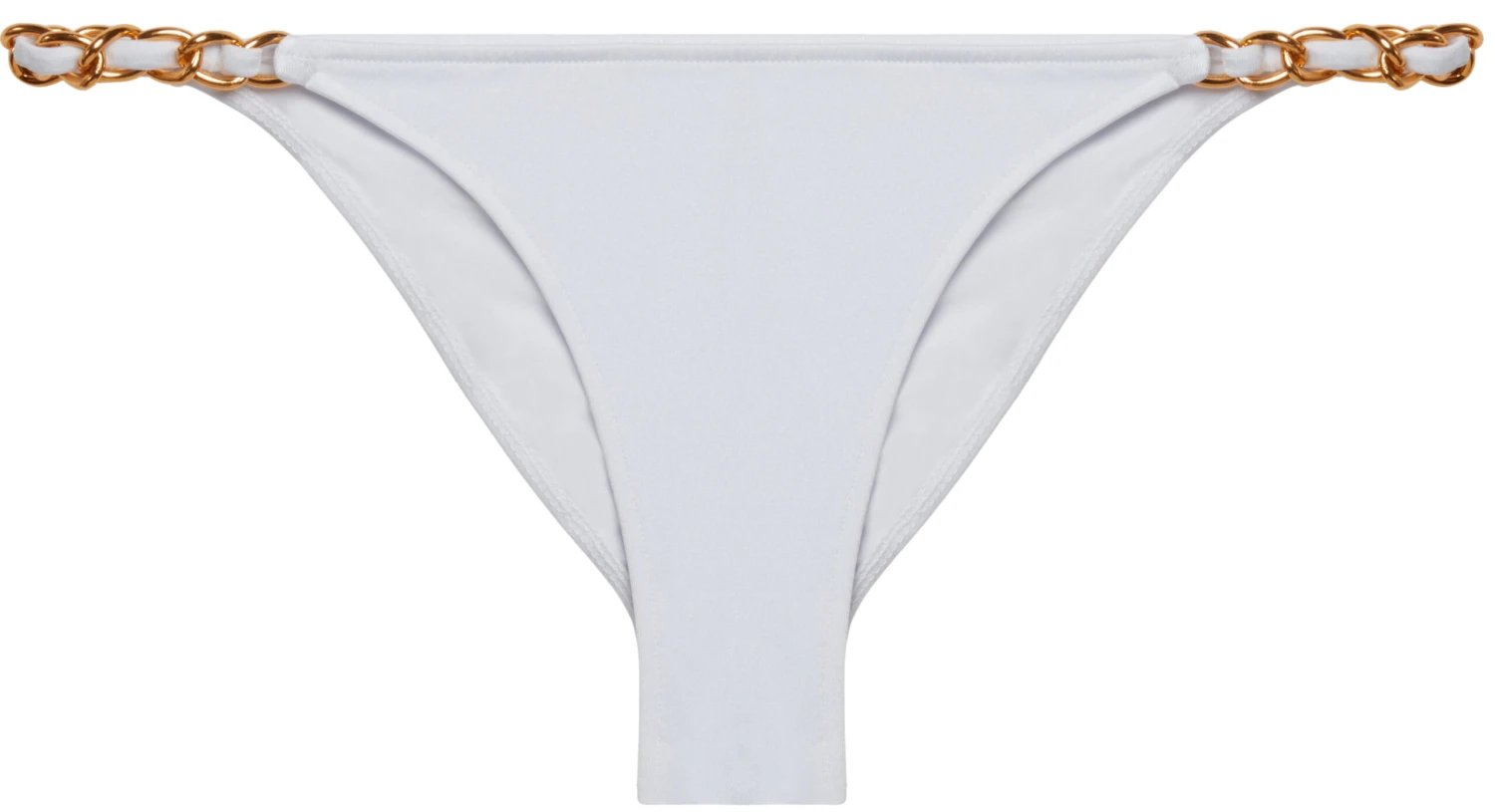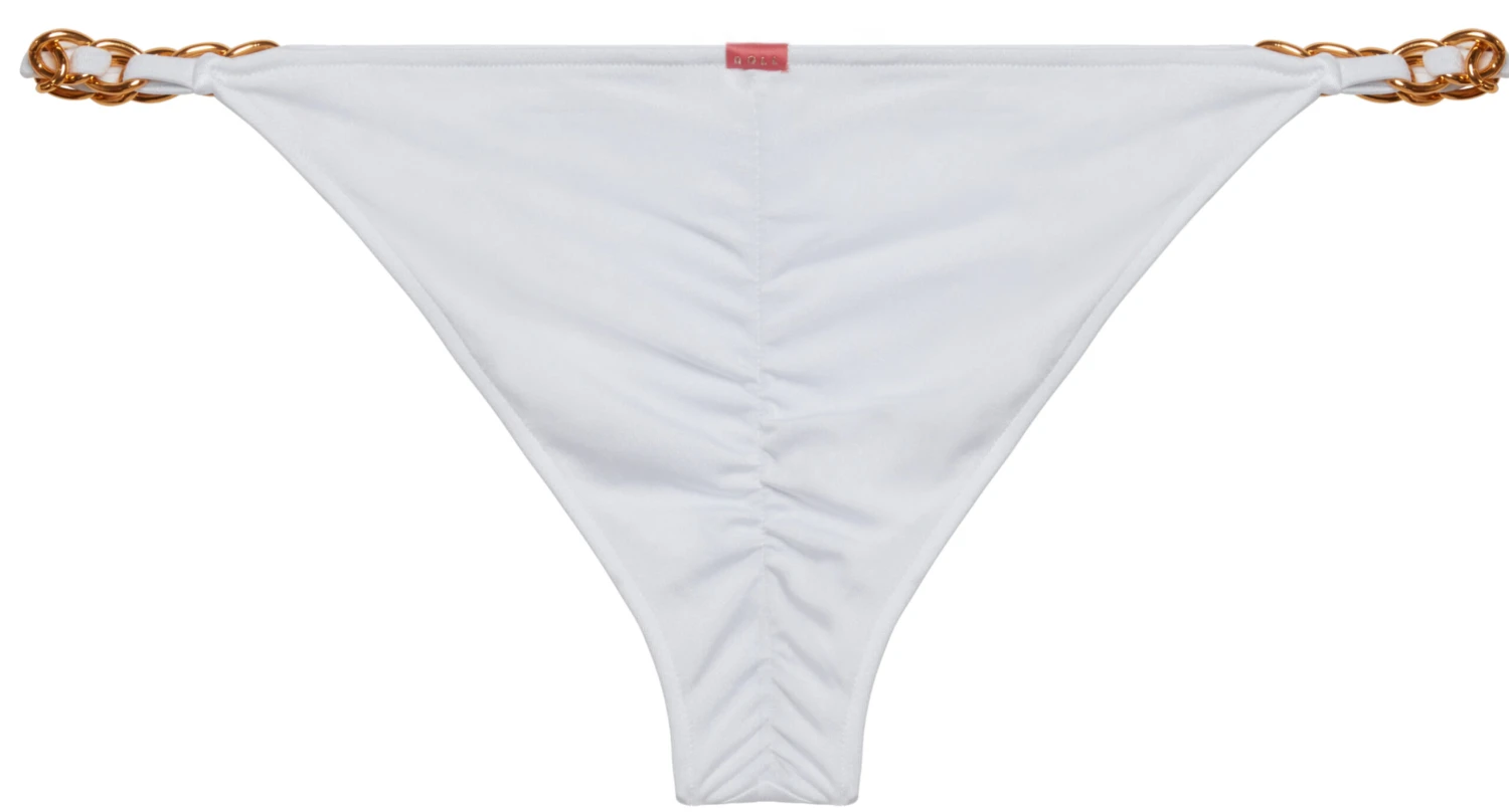 Perfect for the beach or day club, this resort-ready designer bikini features our classic scrunch bottoms with gorgeous gold chain accents. All made right here in sunny SoCal! DETAILS: Made in the USA. Banded classic scrunch bottoms with wide gold chain accents. Fully lined. CARE INSTRUCTIONS: Hand wash, line dry, no bleach, cool iron if necessary.