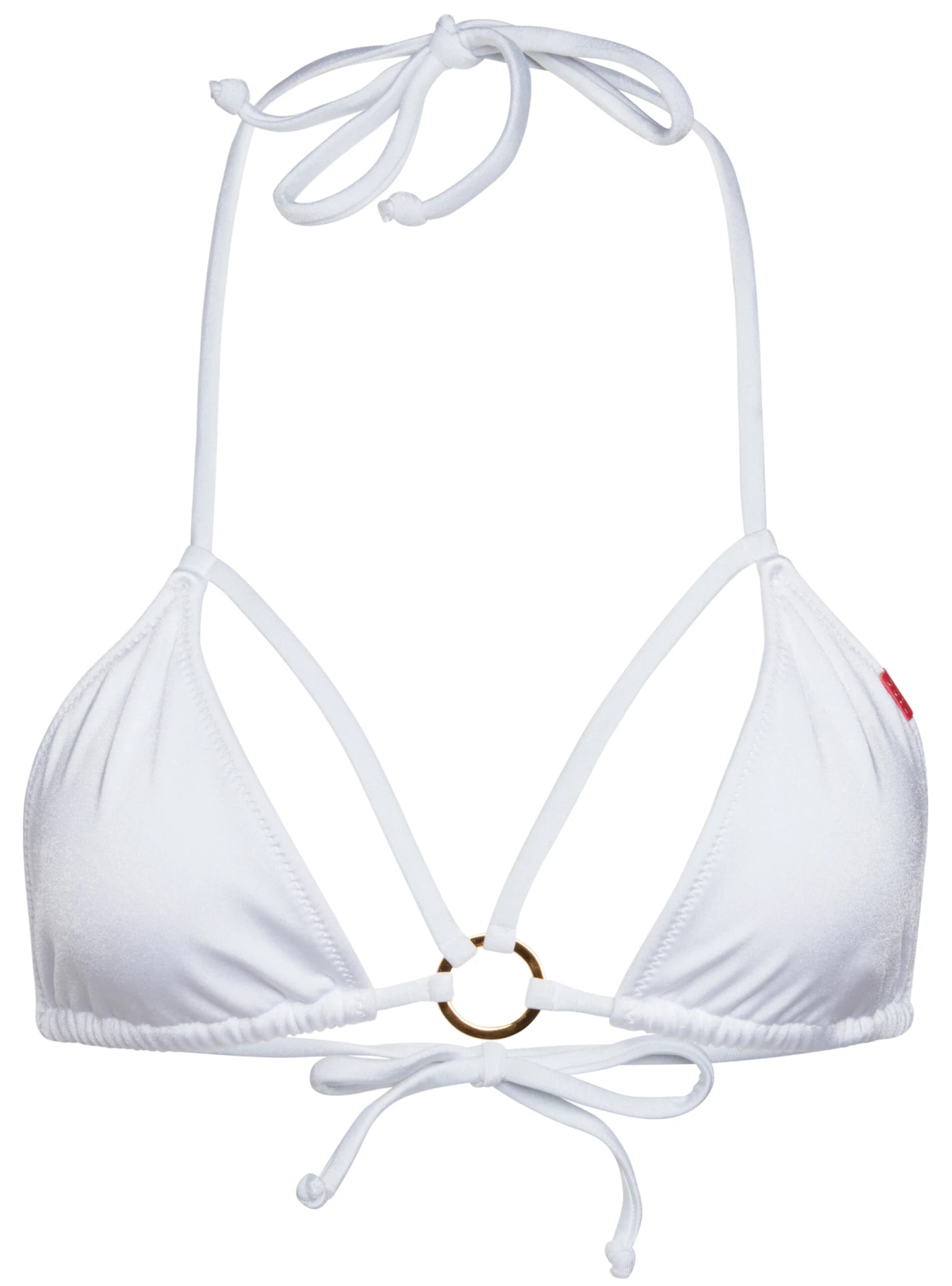 DETAILS: Made in the USA, fully lined. Solid body, clean finish with no binding trim. Adjustable double strap center loop triangle string bikini top with skinny neckties and bust pad pockets. CARE INSTRUCTIONS: Hand wash, line dry, no bleach, cool iron if necessary.