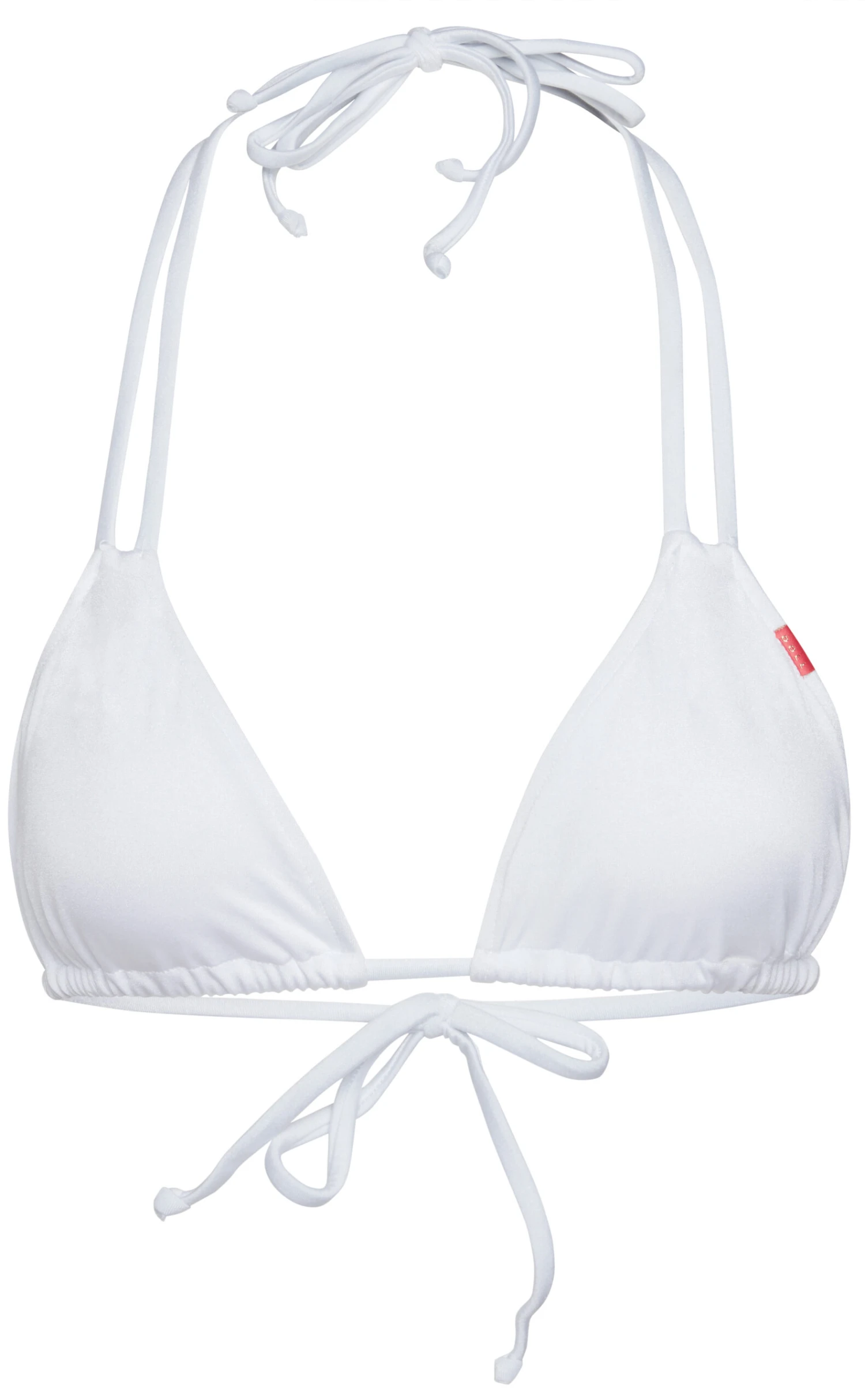 Solid white double strap bikini top. DETAILS: Made in the USA, fully lined. Adjustable triangle string bikini top, skinny double strap skinny neck ties, bust pad pockets. CARE INSTRUCTIONS: Hand wash, line dry, no bleach, cool iron if necessary.